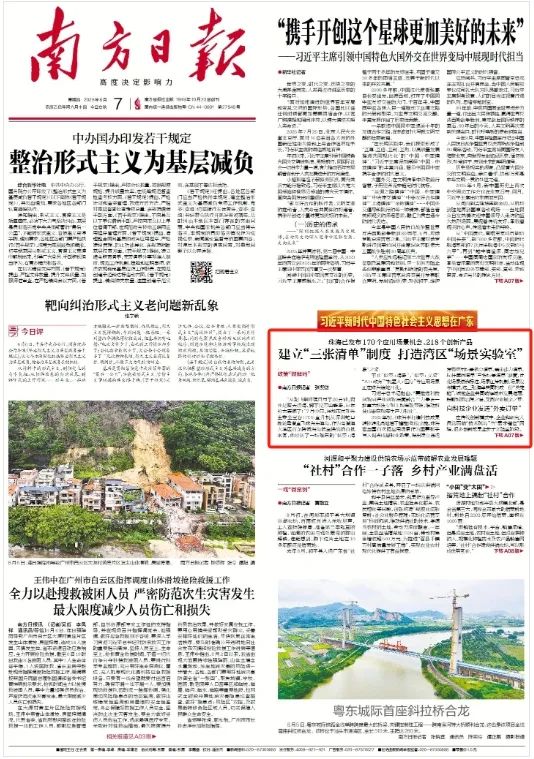 今天,《南方日报》头版推出题为《珠海已发布170个应用场景机会、218个创新产品建立“三张清单”制度打造湾区“场景实验室”》的报道。